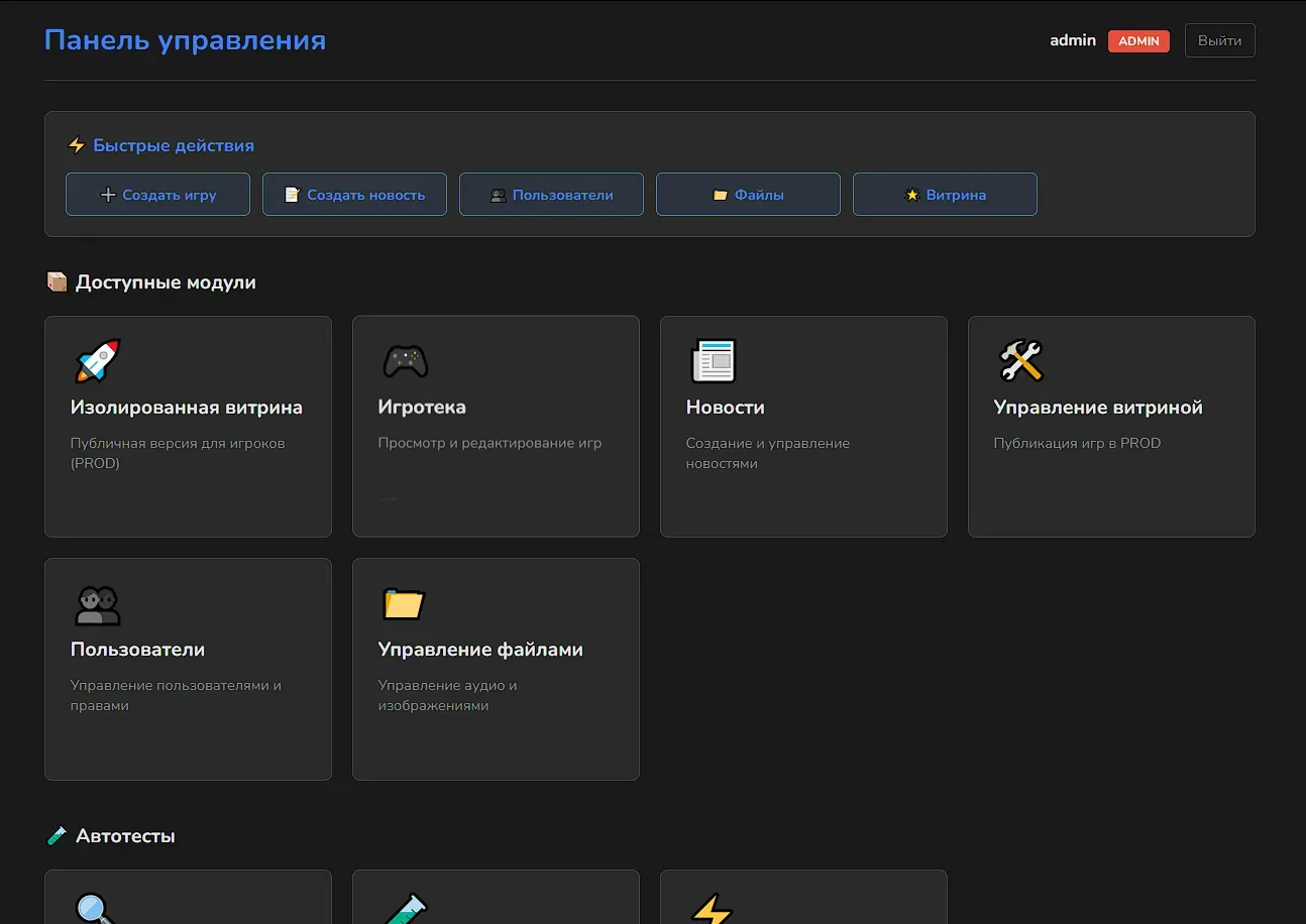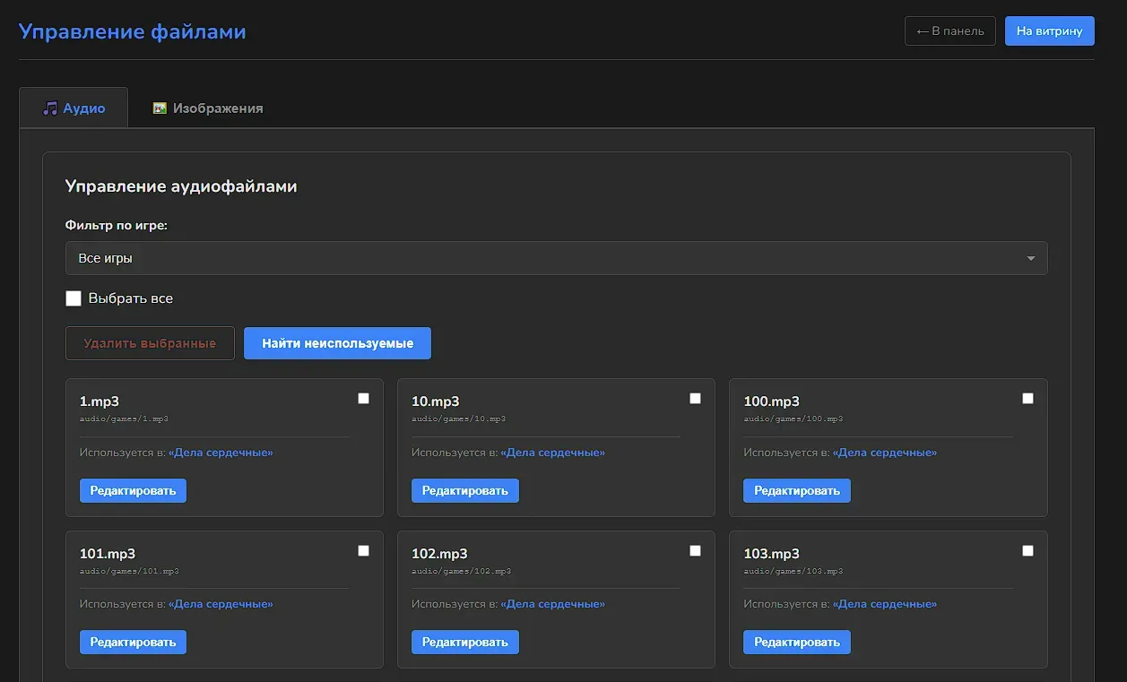 А вот этот модуль сильно изменился. Во-первых, изначально он находился внутри редактора и был кривоватый. Но такая мощь, на мой взгляд, может быть доступна в принципе только для админа, так что в админку я это и перенес. Для чего он вообще нужен? Место на серваке не безгранично, какие-то игры могли быть созданы временно на тест, какие-то файлы в эти игры загружались, а как потом искать то, что уже не используется? Вот для такого я и создал этот модуль. Находим не используемые ни в одной из игр картинки или аудиофайлы — и удаляем.