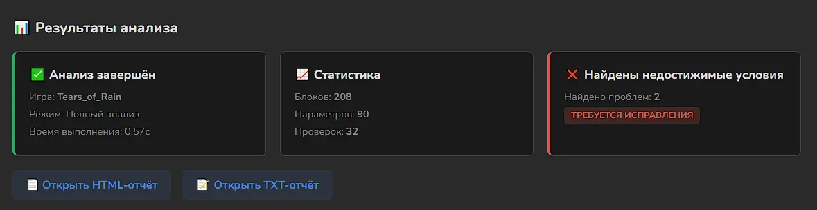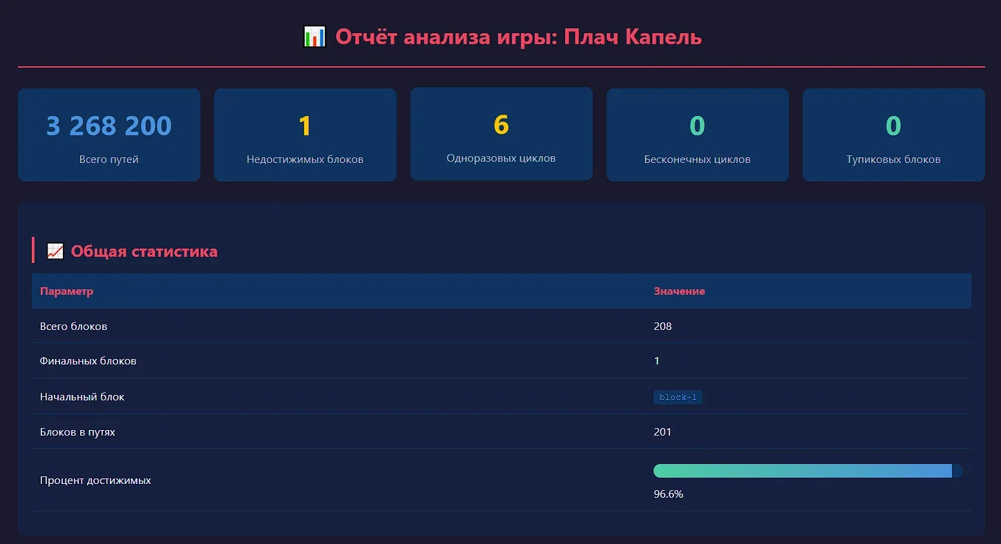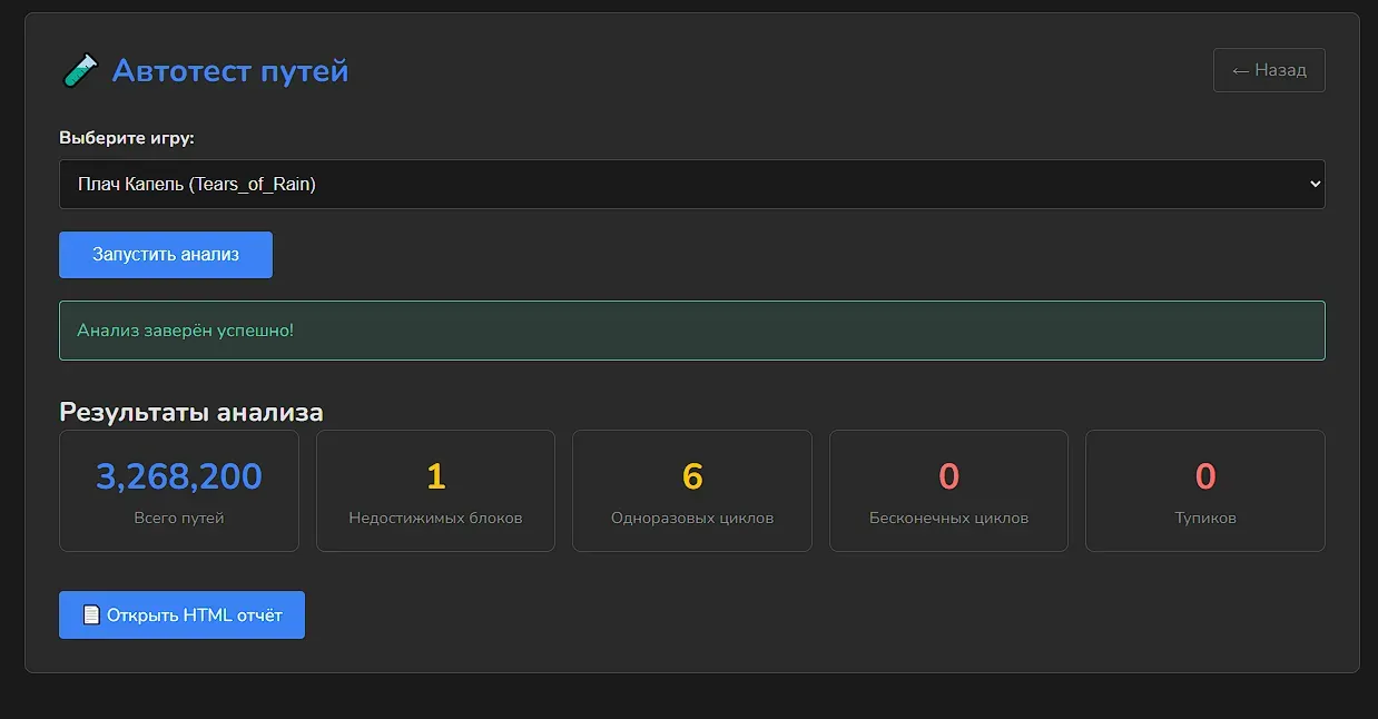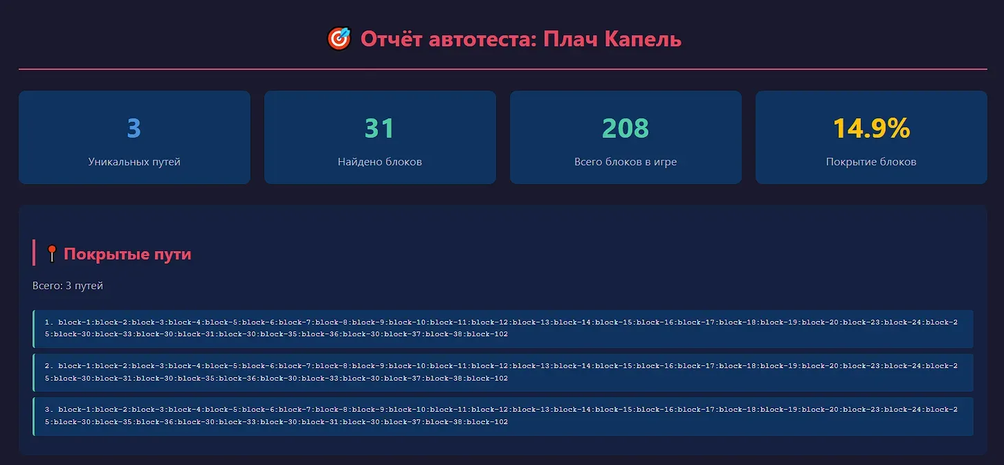 Каждый раз, когда скрипты проходят и находят новый путь и блок, это записывается в основной файл, который хранит в себе все маршруты. То есть можно запускать периодически или запускать с очисткой, чтобы всю игру проверять заново, в любом случае я бы не ждал полного процента покрытия игры, это будет очень долго. ##### Отчет