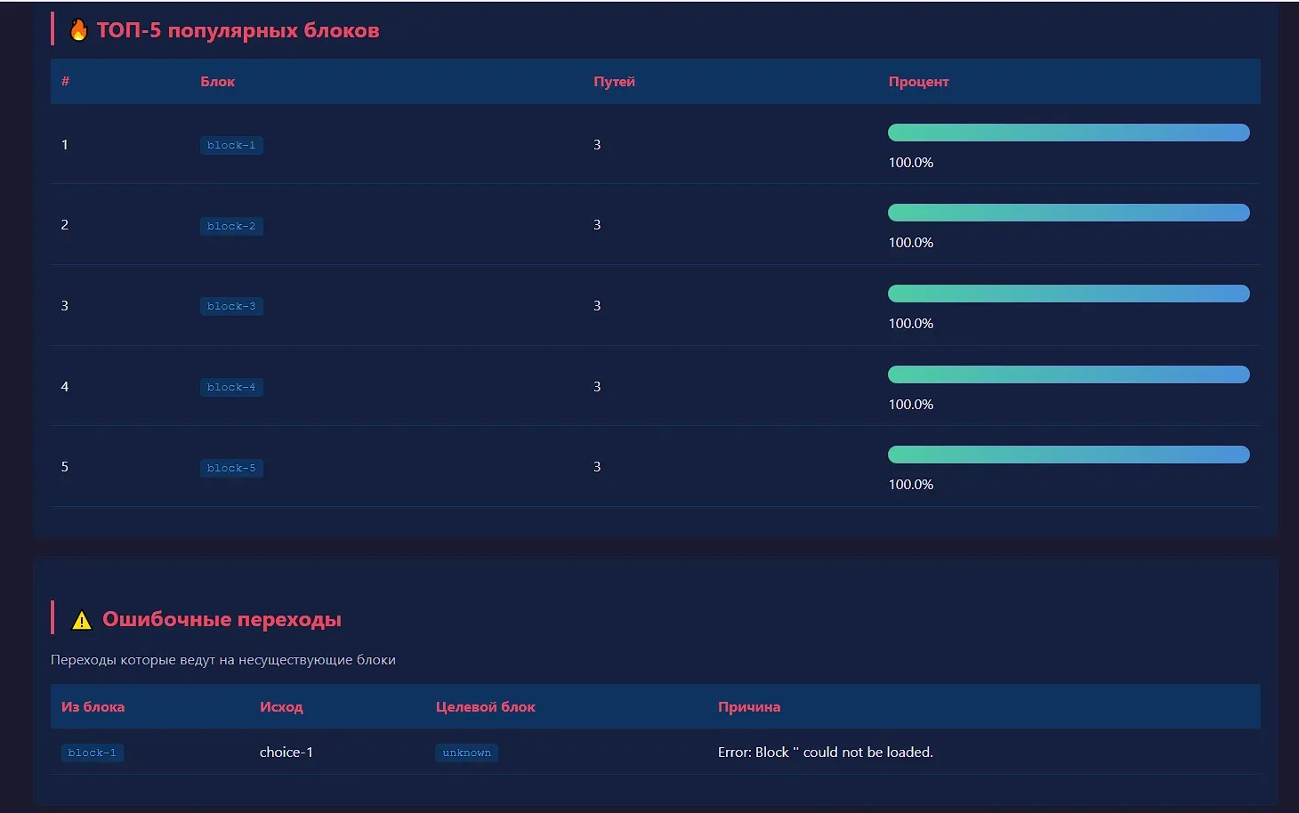 Также тут показывается топ 5 блоков, которые посещаются чаще всего, чтобы понимать их важность. Так как всего было 3 прохода, то все 100%, но на большем количестве процент будет меняться. И ошибочные переходы, если были какие-то ошибки, это на время теста я добавлял, чтобы можно было посмотреть, как будет в отчете.