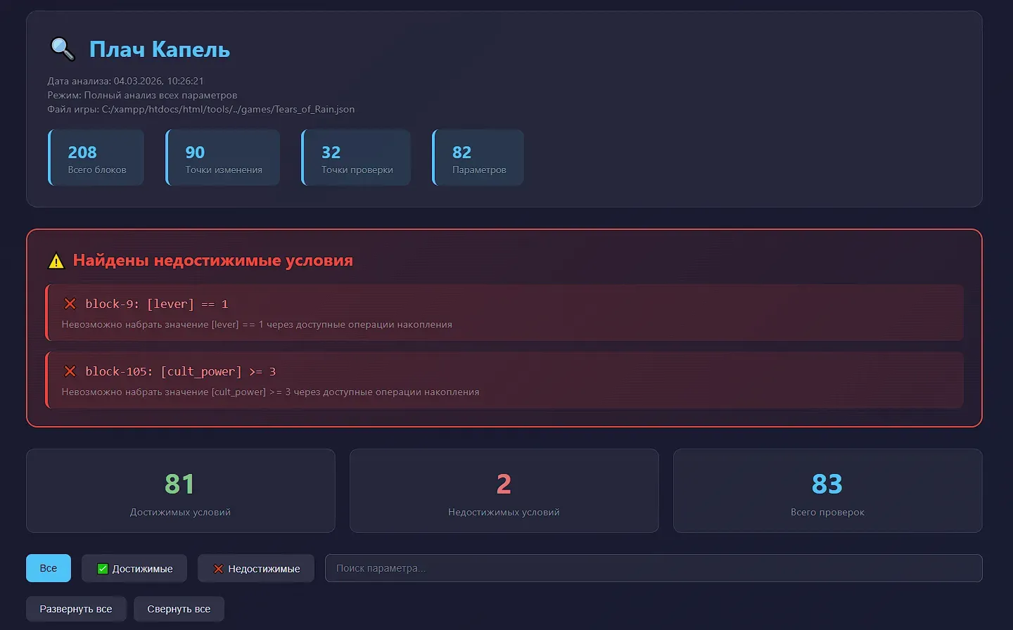 Дело в том, что огромная вариативность и человеческий фактор всегда оставляют место для ошибок еще на этапе создания игры. Которые позже в тестировании выливаются в очень коварные баги, сложные для выявления. Например, подсчет значений параметра для условия в блоке. Простым языком, чтобы попасть в особенно хитрый блок, требуется сразу несколько параметров с определенными значениями, так еще и собранные хитрыми маршрутами. Посетил комнату А, взял предмет в комнате Б, не стал делать в С и так далее. Проверять всё это вручную, к тому же в соло-разработке, практически нереально. Вот я и решил немного поработать в движке над автотестами, а заодно привести в порядок некоторые аспекты движка, которые мозолили глаза.